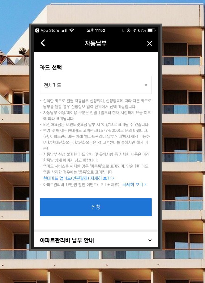 마지막으로 아파트 관리비를 납부할 때 사용할 현대카드를 선택해 주세요. 신청 버튼을 누르면 신청이 완료됩니다.