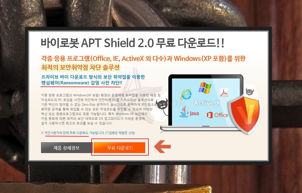재부팅하고, 금융감독원 팝업창이 나타나는지 확인해보세요. 완벽하게 삭제가 되었다면 나타나지 않을 텐데요. 다음부터 이런 문제가 발생하지 않도록 예방하는 방법을 알려드리겠습니다. 바이로봇 APT를 접속해주세요.