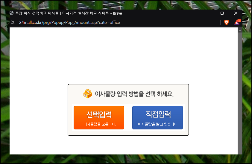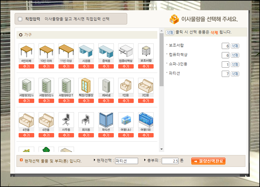 짐 물량을 정확히 입력하면 더 정밀한 이사 견적을 받을 수 있어요. 수량을 알고 있다면 '선택 입력', 잘 모른다면 '직접 입력' 옵션을 활용하세요. 직접 입력 화면에서는 의자, 책상, 컴퓨터, 프린터, 복사기, 에어컨 등 사무실에서 흔히 사용이 되는 물품을 선택할 수 있습니다. 운송할 모든 물품을 꼼꼼히 체크해주세요.