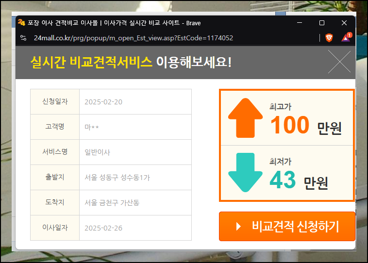 모든 단계를 거치지 않더라도 초기 화면의 가격 리스트를 통해 대략적인 시세 파악이 가능합니다. 이러한 방법을 통해 제대로 비교하여 스마트한 업체 선정을 할 수 있어요. 합리적인 요금과 신뢰할 수 있는 업체를 판별하는 데에 도움이 될 거에요.