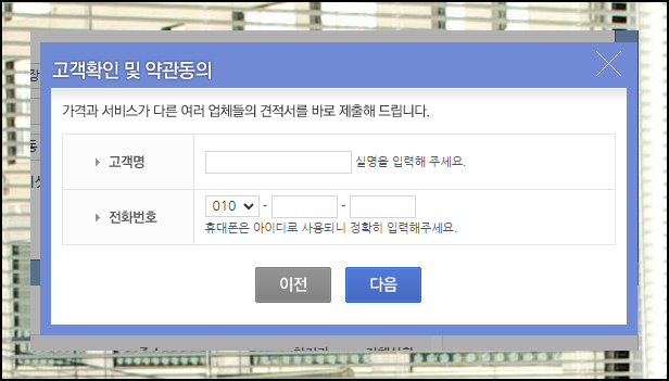 마지막으로 의뢰목적과 고객성향, 이사 옵션을 체크해 줍니다. 이렇게 입력 양식을 모두 채웠다면 [신청] 버튼을 눌러주세요. 그 다음에는 연락 받을 고객 정보를 기입하고 [다음] 버튼을 누릅니다. 그럼 여러 회사의 사무실 이사 견적을 받아 한 번에 비교할 수 있어요.