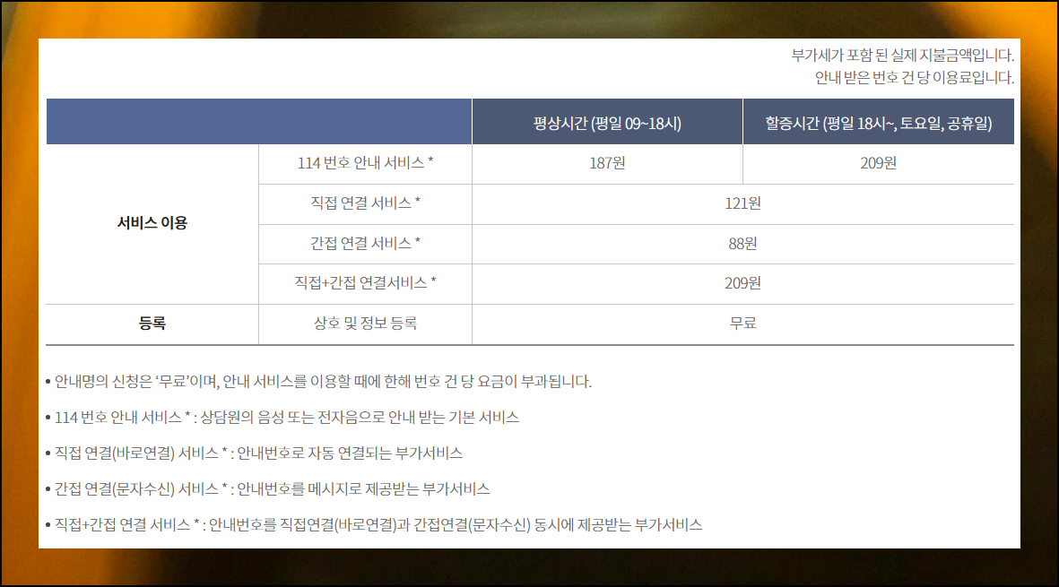 114 서비스 활용 시 요금이 부과돼요. 기본 안내는 187원이나 209원, 즉시 연결 요청 시 121원이 추가되며, 문자 수신은 88원이 발생합니다. 소액이지만 반복 이용 시 부담스러울 수 있으니 꼭 알아두세요. 이 비용은 월말 청구서에 통합될 겁니다. 참고로 서울 콜택시 이용 또는 예약할 때 발생하는 요금과는 별개이니 혼동하지 마세요.