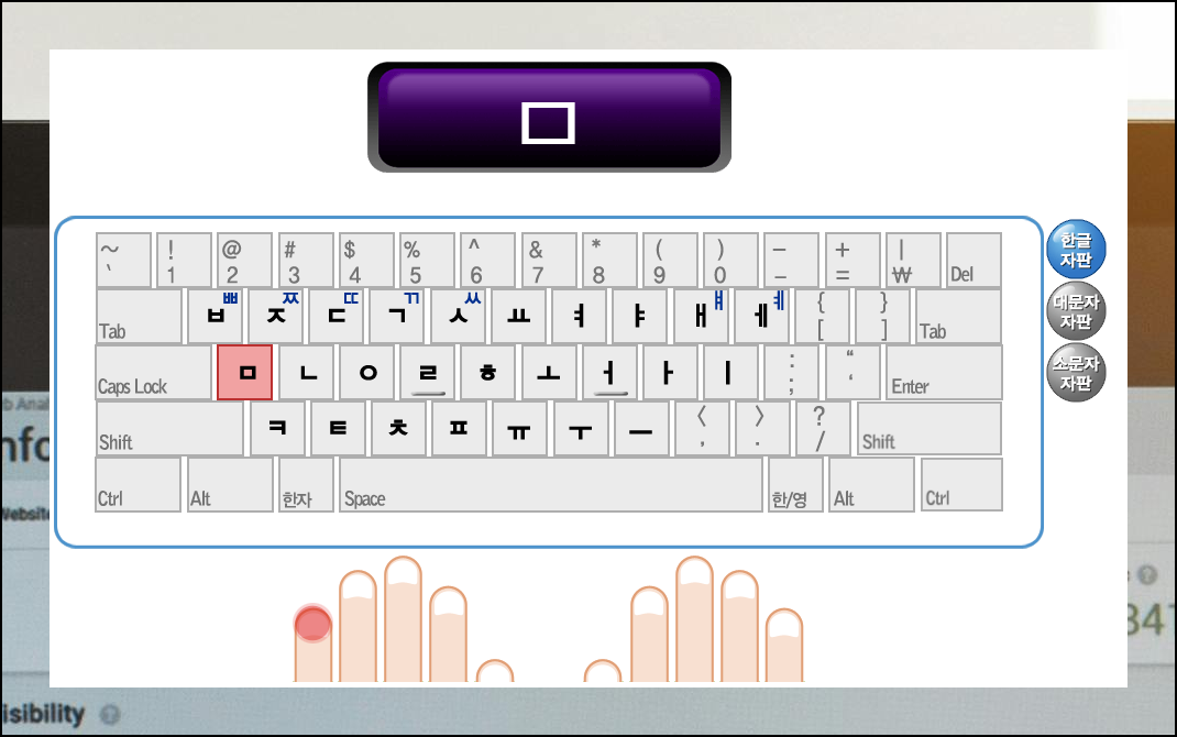 키보드 이미지 오른쪽에서 영문 모드로 쉽게 전환할 수 있습니다. 영어 타이핑도 올바른 손가락 위치가 기본이니, 화면에 표시된 손가락 가이드를 참고하세요. 꾸준한 연습으로 키보드 자판의 한글과 영문 버튼을 제대로 파악할 수 있습니다.