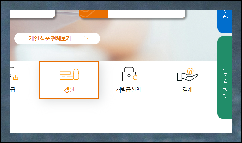 한국정보인증 사이트에 접속한 후, 먼저 사용 중인 공동인증서 종류를 선택해주세요. 그런 다음 화면 맨 오른쪽에 있는 [관리] 메뉴를 클릭하세요. 화면에는 발급, 갱신, 재발급 신청 등 여러 서비스를 제공하고 있는 것을 알 수 있는데요. 추후 필요할 때 이용해 보시길 바랍니다.