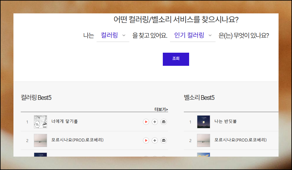 선택한 통신사의 컬러링 페이지에서 다음과 같이 따라하면 돼요. SKT 기준으로 설명해 드릴게요. 일단 해당 페이지가 열리면 인기 컬러링 목록이 표시됩니다. 여기에서 [더보기] 버튼을 눌러보세요. 그럼 휴대폰 통화연결음으로 사용하기에 좋은 음원을 많이 살펴볼 수 있습니다.