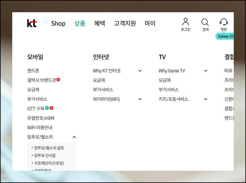 KT는 통화연결음 서비스를 '링투유'라고 부릅니다. KT 웹사이트에서 [상품] 메뉴를 선택한 다음, 모바일 카테고리에 있는 [링투유 / 벨소리 설정]을 클릭하면 돼요. 이렇게 휴대폰 컬러링 서비스에 대한 메뉴 위치는 다르지만, 설정하거나 음원 바꾸는 방법은 서로 비슷합니다.