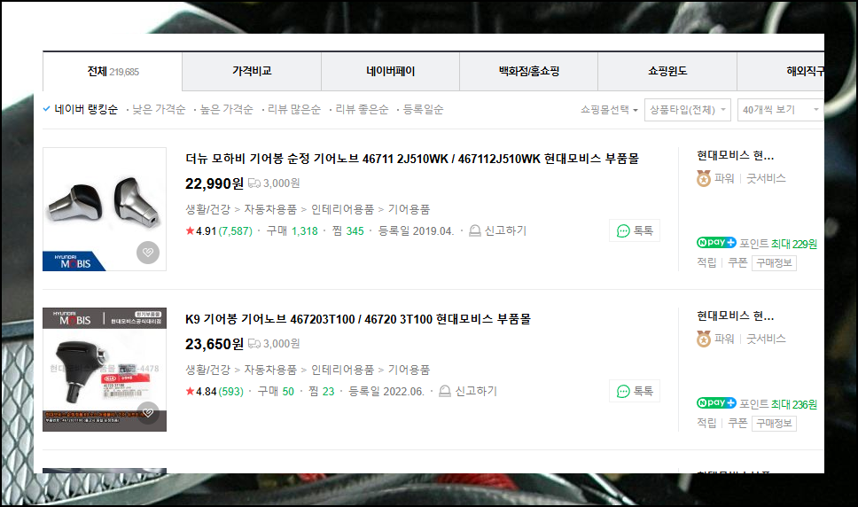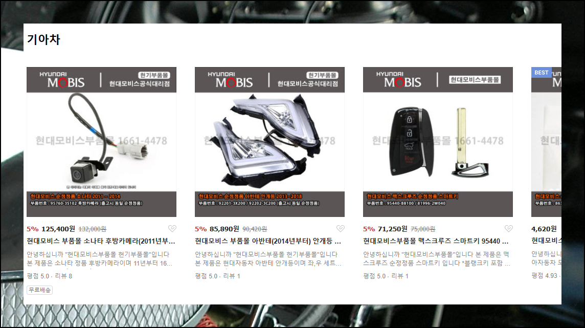 네이버 쇼핑에서 '현대모비스 부품몰'을 검색하면 또 다른 기아자동차 전용 쇼핑몰을 찾을 수 있어요. 공식 대리점에서 운영하기 때문에 정확한 아이템을 간편하게 찾을 수 있습니다. 믿을 수 있는 정식 채널을 통해 안심하고 주문할 수 있어요.