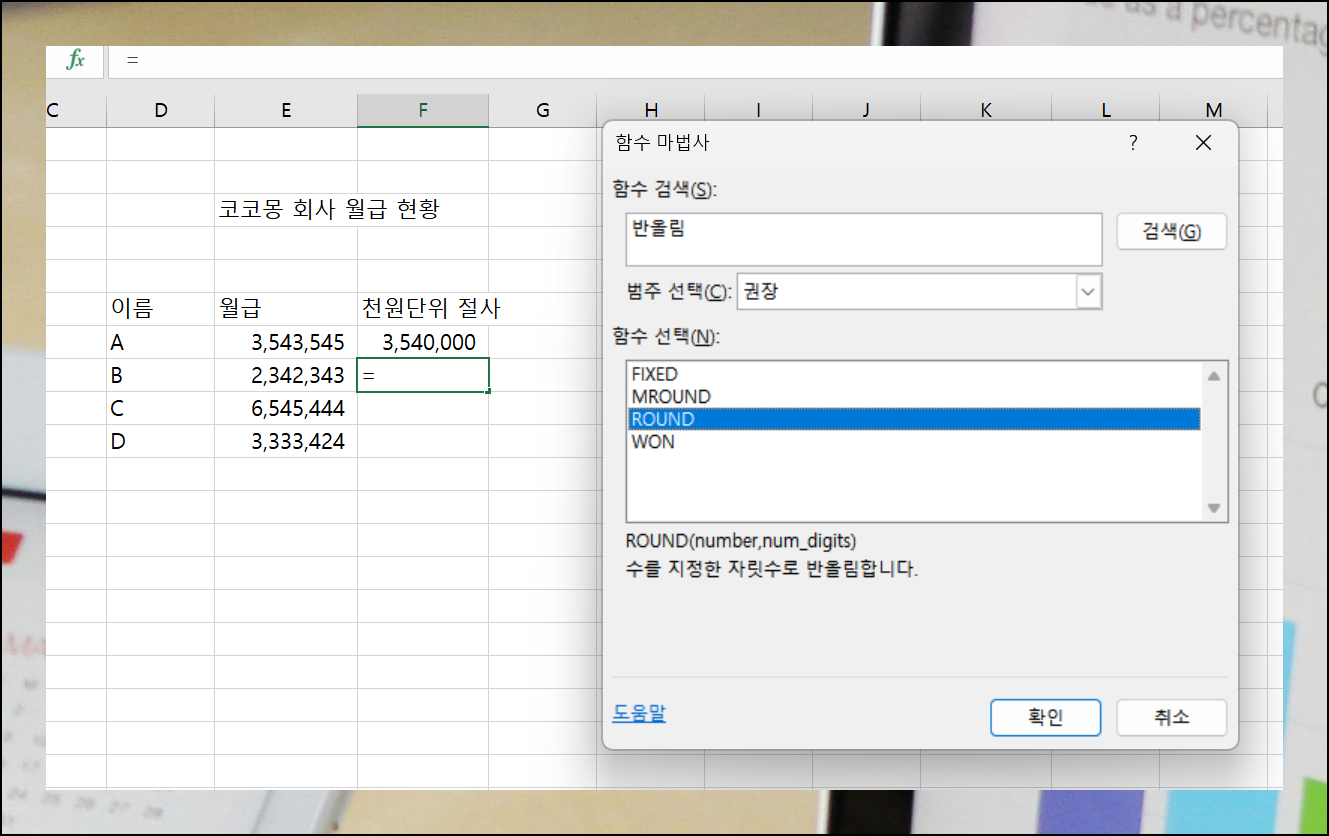 내림 처리 대신 반올림을 원한다면 비슷한 방법을 사용하면 돼요. 함수 검색에서 반올림을 입력하면 Round 함수를 찾을 수 있어요. 사용 방법은 RoundDown과 거의 똑같아요. 숫자 부분에 원본 데이터를 넣고, 자릿수 부분에 -4를 입력하면 천 단위 반올림이 완료됩니다.