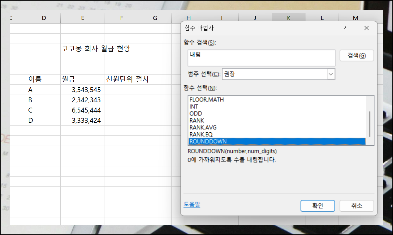 RoundDown 함수가 나타나는데, 이게 바로 우리가 찾던 엑셀 기능이에요. 함수 설명을 보면 0에 가까워지도록 수를 내린다고 되어 있어요. 천원단위 절사를 위해 확인을 눌러주세요.