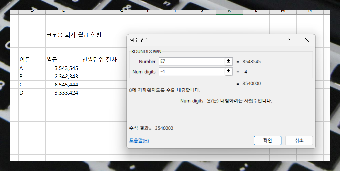 해당 엑셀 함수는 생각보다 정말 쉬워요. 두 개의 값만 입력하면 작동해요. 첫 번째는 Number인데 여기에 원본 급여 데이터를 넣어주세요. 셀 주소로 입력해도 괜찮아요. 두 번째는 Num_digits로 어느 자리에서 절사할지 정하는 거예요. 0을 기준점으로 해서 마이너스 숫자를 입력하면 천원단위 내림 처리가 돼요. 천원의 경우 -4를 입력하고, 백원의 경우에는 -3을 넣으면 됩니다.