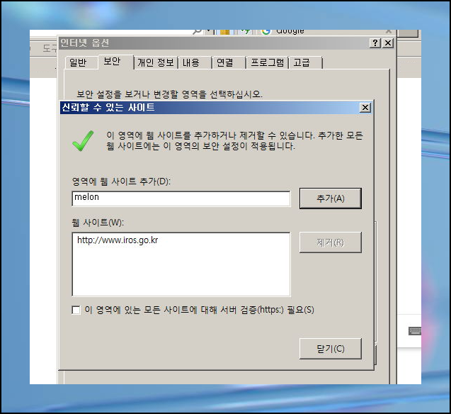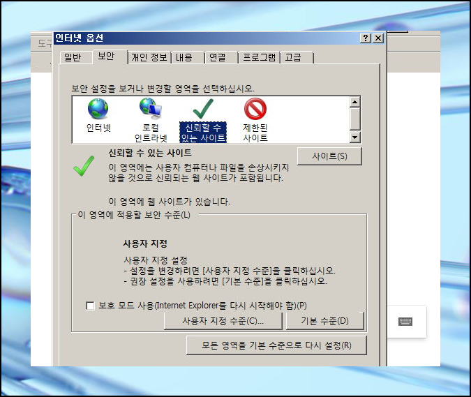 인터넷 옵션 창이 열리면 '보안' 탭을 클릭해보세요. 여기서 '신뢰할 수 있는 웹사이트' 옵션을 찾을 수 있을 거예요. 멜론 플레이어를 브라우저가 믿을 만한 페이지로 인식하게 만드는 작업해줄 수 있습니다. 이렇게 설정하면 재생 중에 발생하는 보안 관련 오류를 예방할 수 있어요. '사이트' 버튼을 눌러서 다음 단계로 진행해주세요.