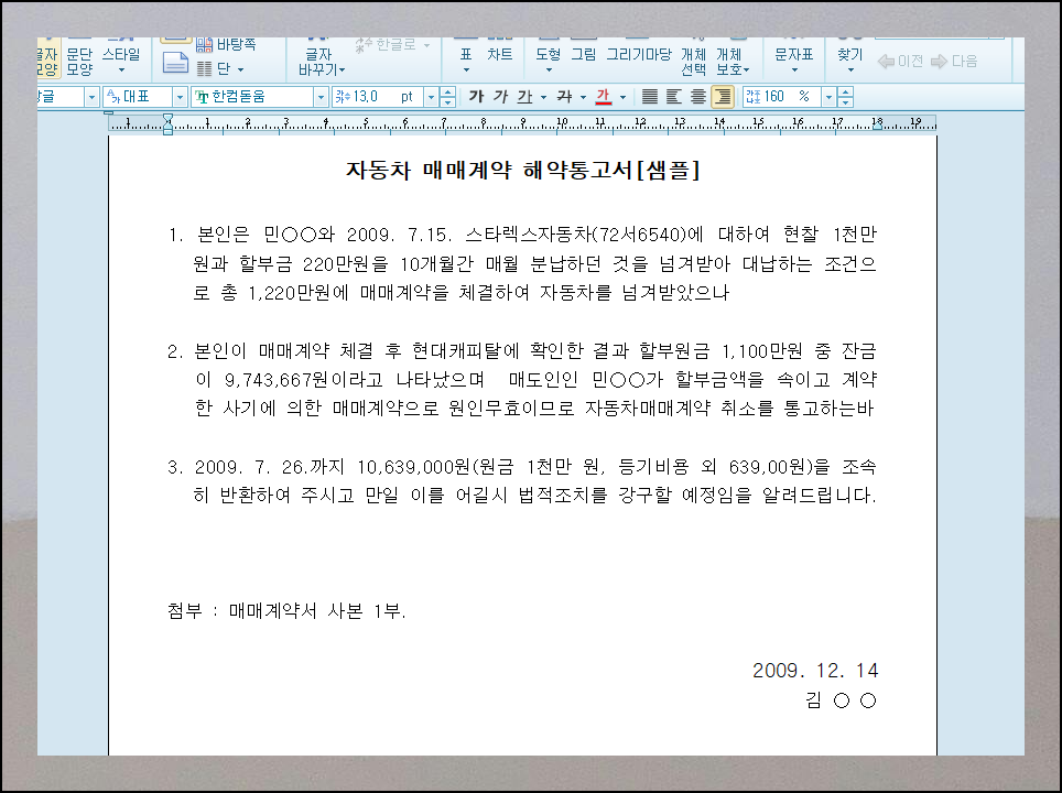 실제로 MS워드 파일로 된 증명서 서식을 다운로드 받아서 확인해 봤어요. "자동차 매매계약 해약통고서" 샘플이었는데요. 예시 내용이 상세하게 작성되어 있어서 이해하기 쉬웠습니다. 실제 상황에 맞게 필요한 부분만 수정해서 사용하면 되니까 처음 작성하는 분들도 부담 없이 따라할 수 있을 거예요.