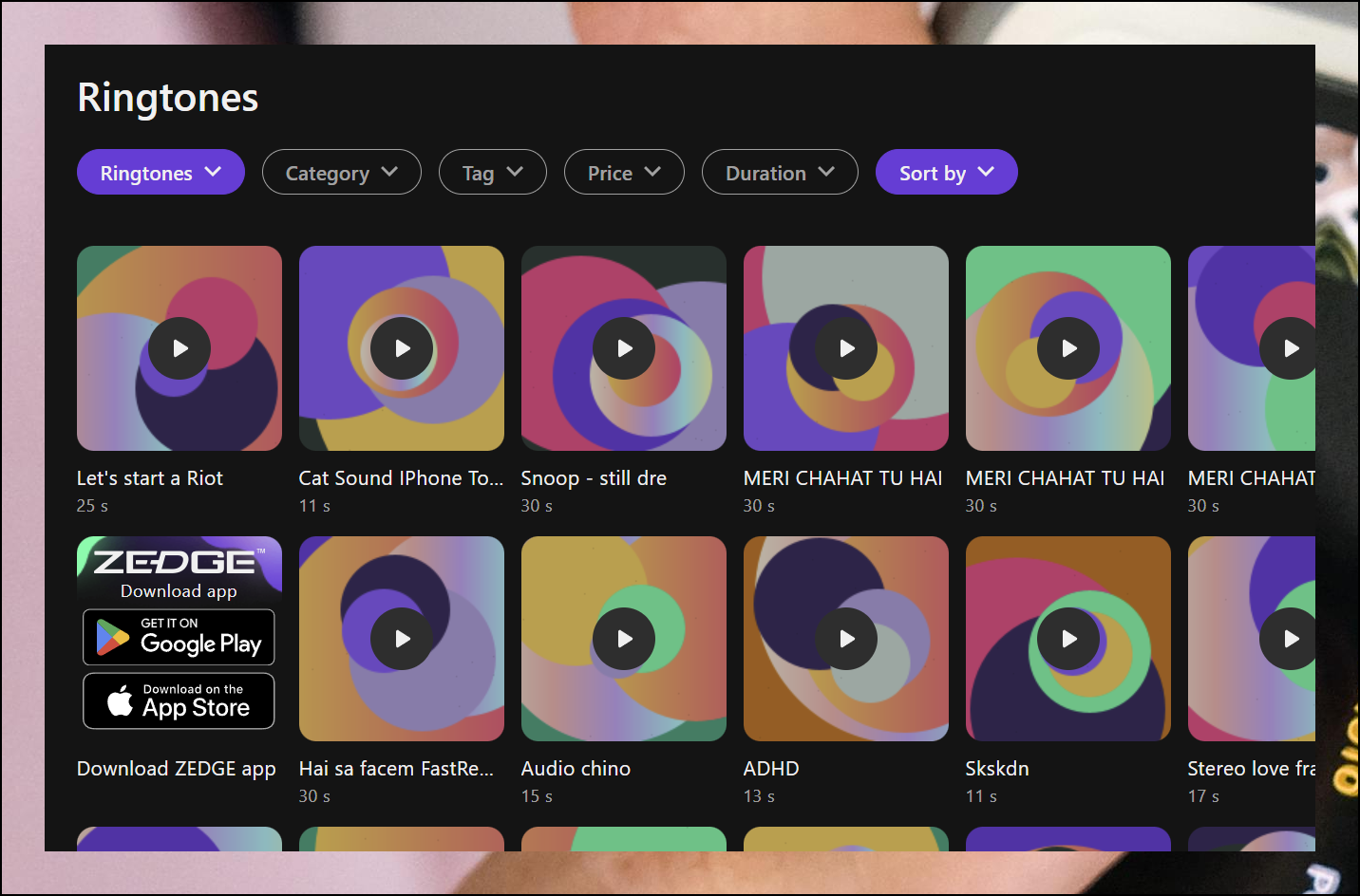 Zedge에서도 미리듣기 기능을 제공하니 다운로드하기 전에 충분히 들어보세요. 정말 많은 종류의 음원을 제공하고 있습니다. 독특하고 개성 있는 음원으로 벨소리 바꾸는법을 진행하고 싶은 분들에게 좋은 선택이 될 수 있어요. 일반적인 음원과는 다른 특별한 것을 찾고 있다면 이곳에서 마음에 드는 것을 발견할 수 있을 거예요.