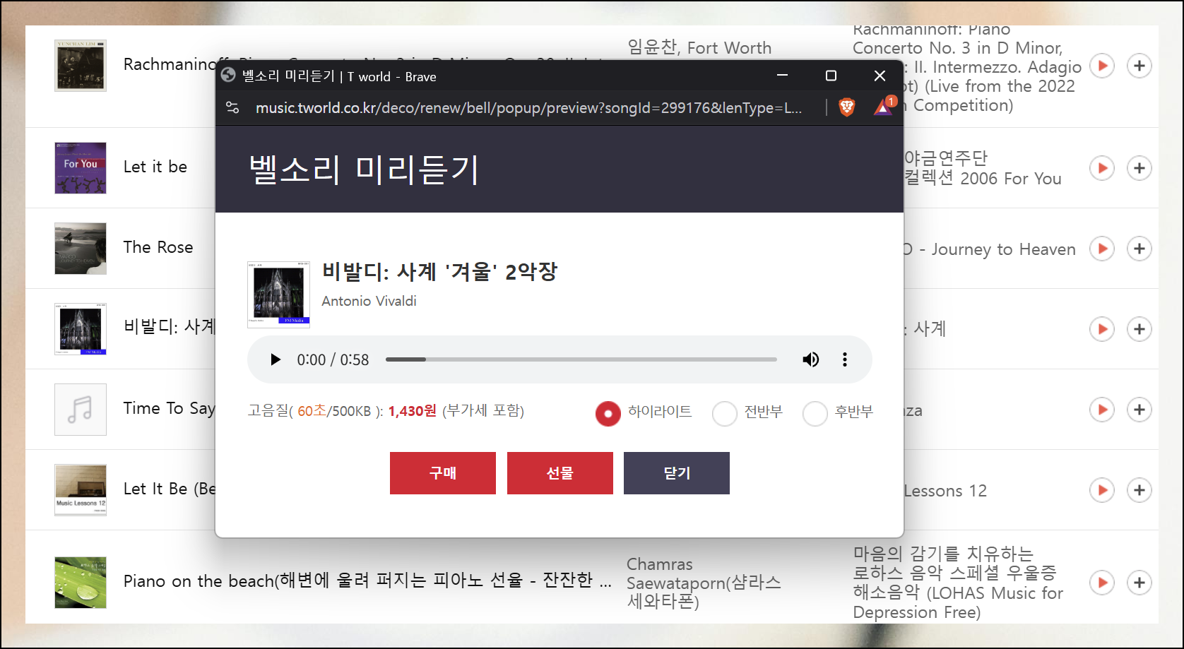 티월드에서는 일반 음질과 고품질 음질 벨소리를 모두 제공합니다. 고품질 음원은 부가세 포함 1,430원에 구입할 수 있어요. 음질 차이를 크게 느끼지 못하는 분들도 있지만, 음질을 중요하게 생각하는 분들은 고음질로 바꾸는 것이 좋습니다.