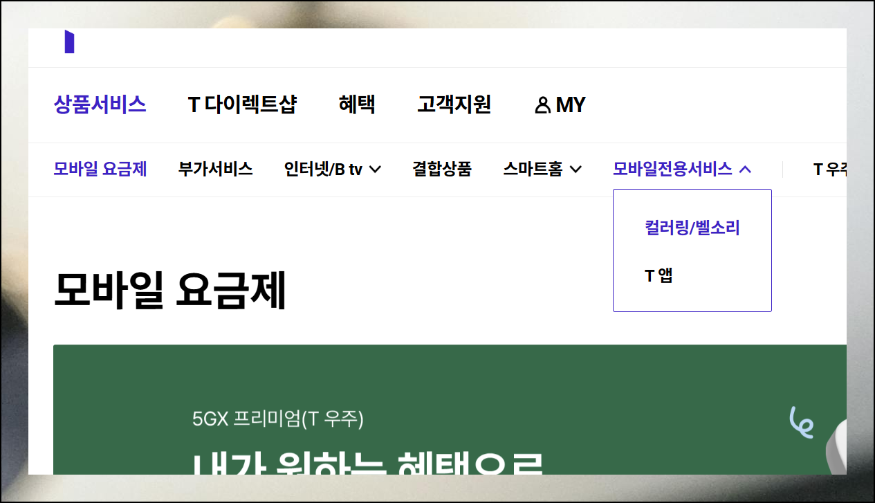 티월드 홈페이지에 들어간 후 상단 메뉴에서 "상품 서비스" 항목을 클릭해보세요. 화면에 표시되는 다양한 옵션 중에서 우측에 위치한 "모바일 전용 서비스"를 선택하면 컬러링과 벨소리 전용 메뉴를 찾을 수 있습니다. 메뉴가 잘 보이지 않는다면 사이트 상단의 검색 기능을 활용해보세요.