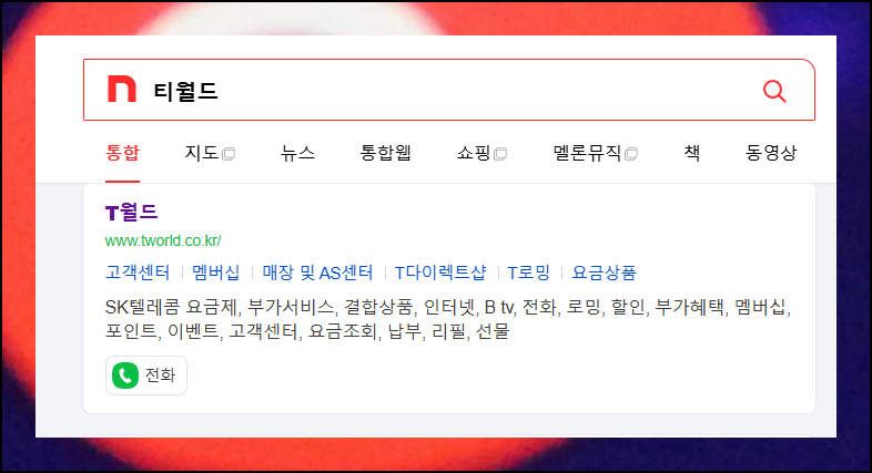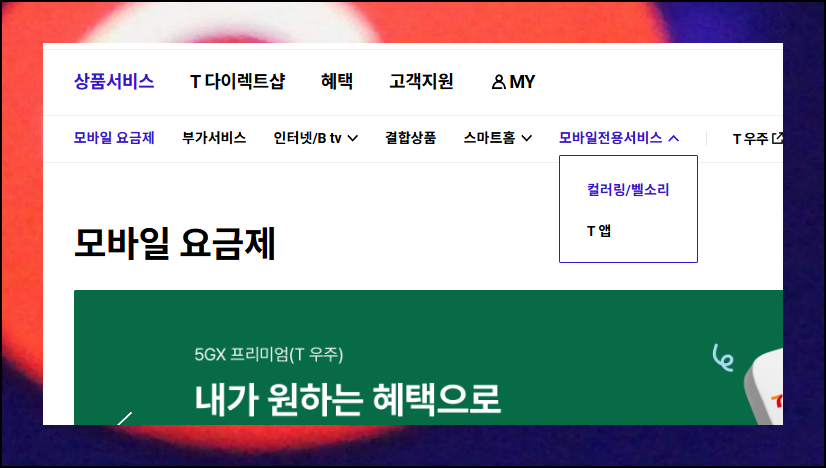 티월드 홈페이지에 접속하면 화면 상단에 여러 메뉴가 정렬되어 있어요. 먼저 상품 서비스 탭을 클릭해주세요. 그 안에서 모바일 전용 서비스를 찾아 선택하고, 최종적으로 컬러링과 벨소리 메뉴를 누르면 됩니다.