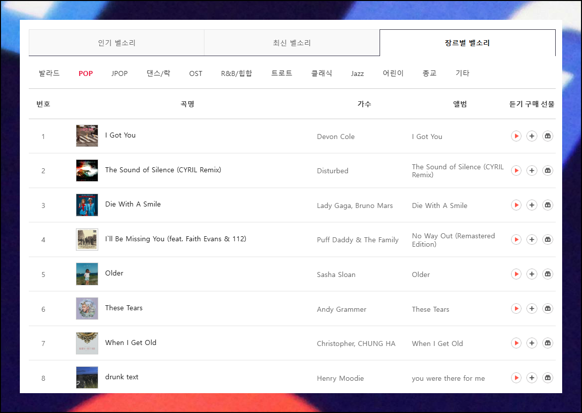 개인적으로 POP 장르를 선호하는 분들에게 특히 유용한 기능이 있어요. 장르별 탭을 선택하면 발라드부터 시작해서 JPOP, POP, 댄스, 락, OST, 트로트, 클래식까지 다양한 장르에서 높은 인기를 얻고 있는 음원 순위를 확인할 수 있습니다.