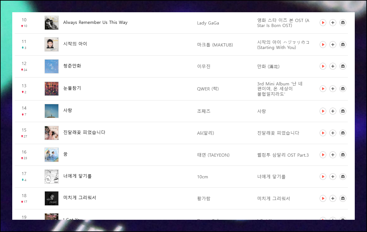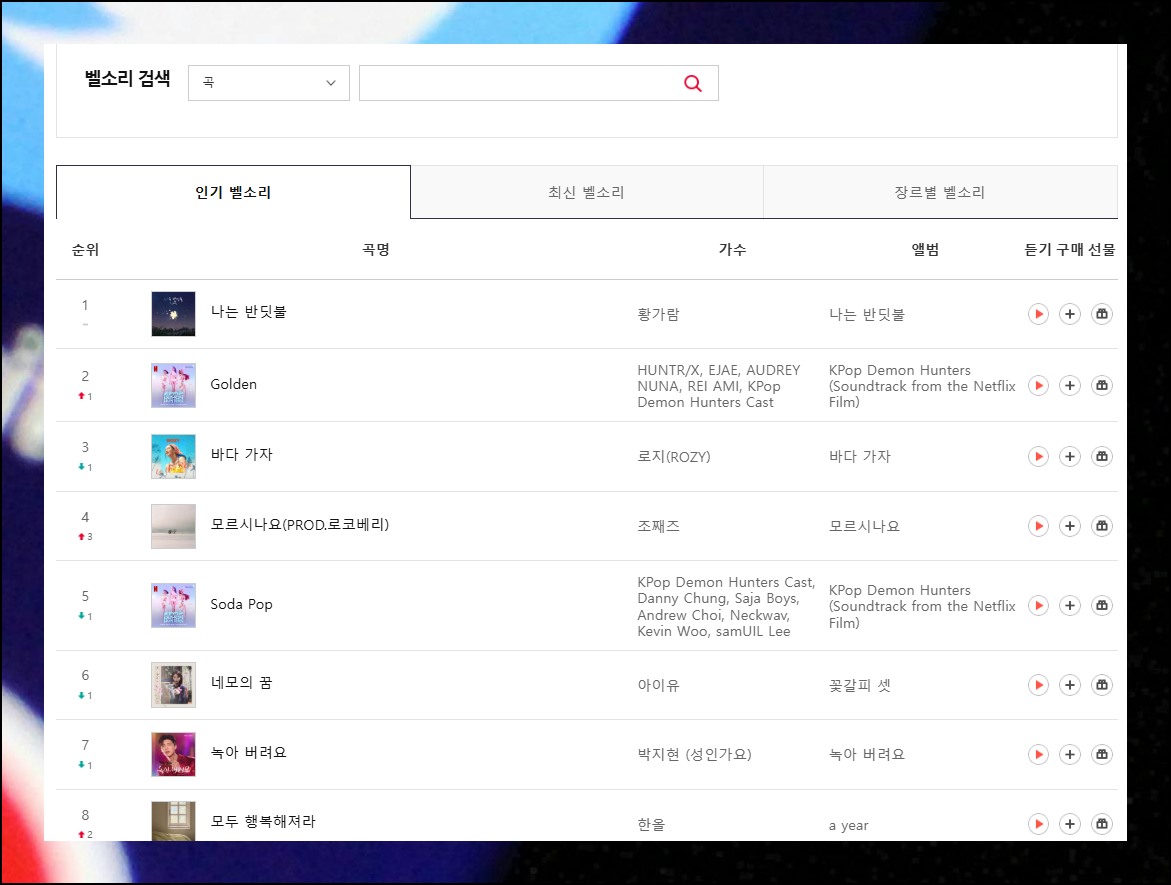 조회 결과로 나타나는 인기 차트를 보면 현재 순위를 한눈에 파악할 수 있어요. 1위는 "나는 반딧불"이라는 곡이 차지하고 있고, 2위에는 "Golden"이 올라와 있어요. 3위는 "바다 가자"가 자리를 지키고 있죠. 4위 "모르시나요"가 최근에 새롭게 차트에 진입한 신선한 음원들로 보입니다.