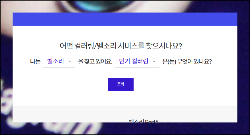 메뉴를 통해 이동한 페이지에서는 사용자가 원하는 서비스를 묻는 선택지가 나타나요. "나는 벨소리를 찾고 있어요"라는 항목을 선택하세요. 그 다음 "인기 벨소리는 무엇이 있나요" 옵션을 고르고, 아래에 있는 조회 버튼을 눌러주면 됩니다.