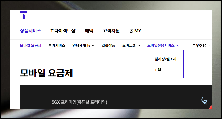 티월드에 접속하면 상단 메뉴에서 "상품 서비스"를 찾아 클릭해 보세요. 요금제나 부가서비스 같은 옵션들이 나타날 거예요. 이 중에서 오른쪽 끝에 위치한 "모바일 전용 서비스"를 선택하면 됩니다. 바로 이곳에서 핸드폰 컬러링과 벨소리를 쉽게 변경할 수 있어요.