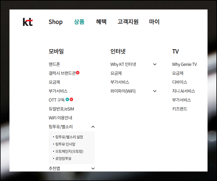 KT 홈페이지에서 마이페이지 바로 옆에 있는 "상품서비스" 메뉴를 클릭해 보세요. "5G/모바일" 카테고리 안에서 "링투유/벨소리" 버튼을 찾으면 됩니다. KT에서는 핸드폰 컬러링을 "링투유"라고 부르거든요. 이 메뉴를 선택하면 서비스 가입부터 음원 변경까지 모든 것을 쉽게 처리할 수 있어요.
