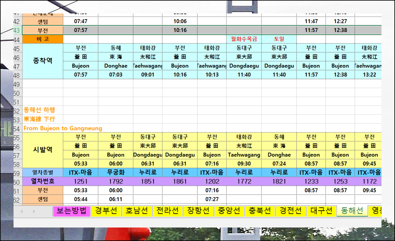 기차시간표 파일 안에는 다양한 시트가 체계적으로 구성되어 있습니다. 경전선, 동해남부선, 중앙선, 영동선 등 부전역을 지나는 모든 철도 노선의 상세 정보를 담고 있어요. 부전역뿐만 아니라 사상역, 구포역, 화명역 등 주변 정거장들의 도착 시간도 함께 확인할 수 있습니다. 환승이 필요한 여행이라면 기차시간표를 참고해서 충분한 여유 시간을 계산해 두시면 됩니다.