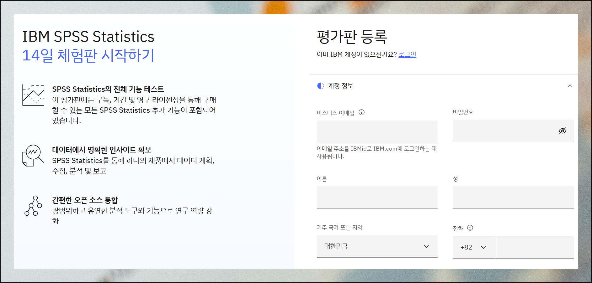 체험판을 다운로드 받기 전에 IBM 사이트 회원가입이 필요해요. 복잡한 절차는 없고 이메일 주소, 이름, 전화번호 정도의 기본 정보만 입력하면 됩니다. 몇 분 안에 가입이 완료되니까 부담스럽지 않을 거예요.