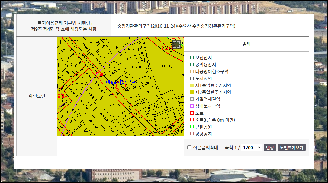 앞서 말씀드린 확인도면을 활용할 수 있어요. 이 도면으로 주거지역, 상업지역, 자연녹지지역 등을 명확하게 구분할 수 있습니다. 지도 영역을 마우스로 클릭하면 고급 기능들을 사용할 수 있어요. 더 넓은 범위의 지도가 화면에 나타나는데, 오른쪽 위에 있는 여러 기능 버튼 중 위성 버튼을 누르면 왼쪽에는 확인도면, 오른쪽에는 위성지도가 표시됩니다.