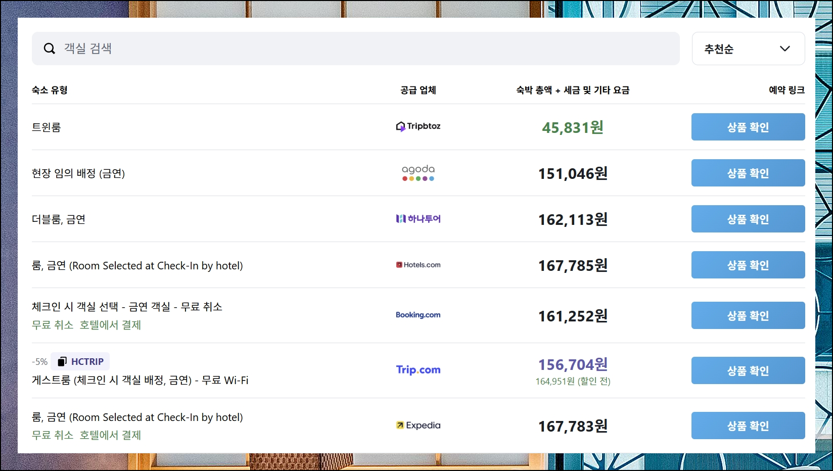 일반적으로 검색하면 추천 숙소 기준으로 결과가 노출되는 것을 확인할 수 있어요. 하지만 경제적인 숙소를 우선적으로 찾고 싶은 경우에는 가격 낮은 순으로 정렬 옵션을 선택하시면 됩니다. 마음에 드는 특정 호텔이 있다면 "웹 사이트 비교하기" 버튼을 활용해서 더욱 합리적인 가격의 장소를 발견할 수 있어요.