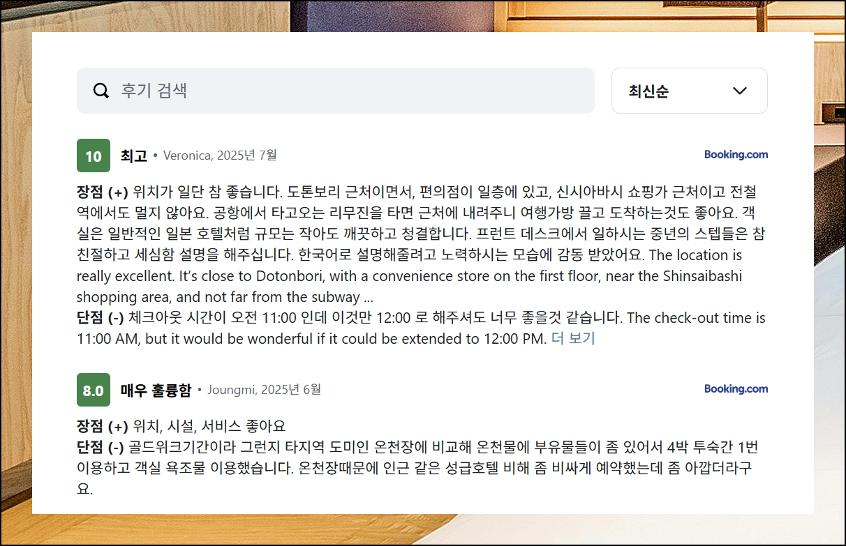일본 숙소를 검색하는 과정에서 합리적인 가격은 마음에 들지만 실제 이용자들의 후기를 점검해서 더 상세하고 풍부한 정보를 바탕으로 더 만족스러운 숙소를 결정하시면 더욱 행복한 여행이 되실 거예요. 그래서 저는 언제나 리뷰나 평점 등을 반드시 확인하고 나서 선택하는 습관을 지니고 있습니다.