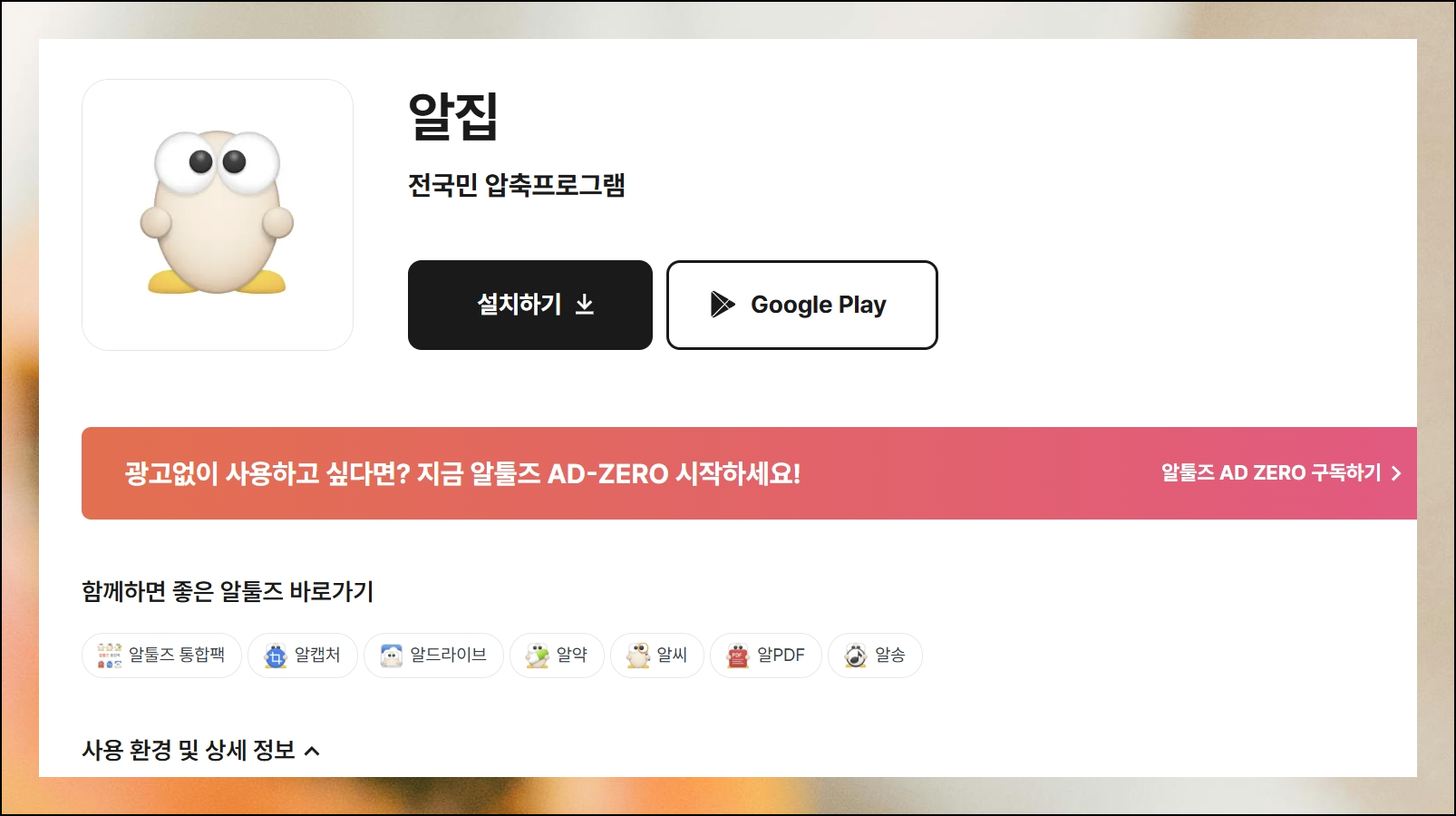 알툴즈 홈페이지 안내문처럼 알집은 파일 압축과 압축 풀기 전문 도구입니다.