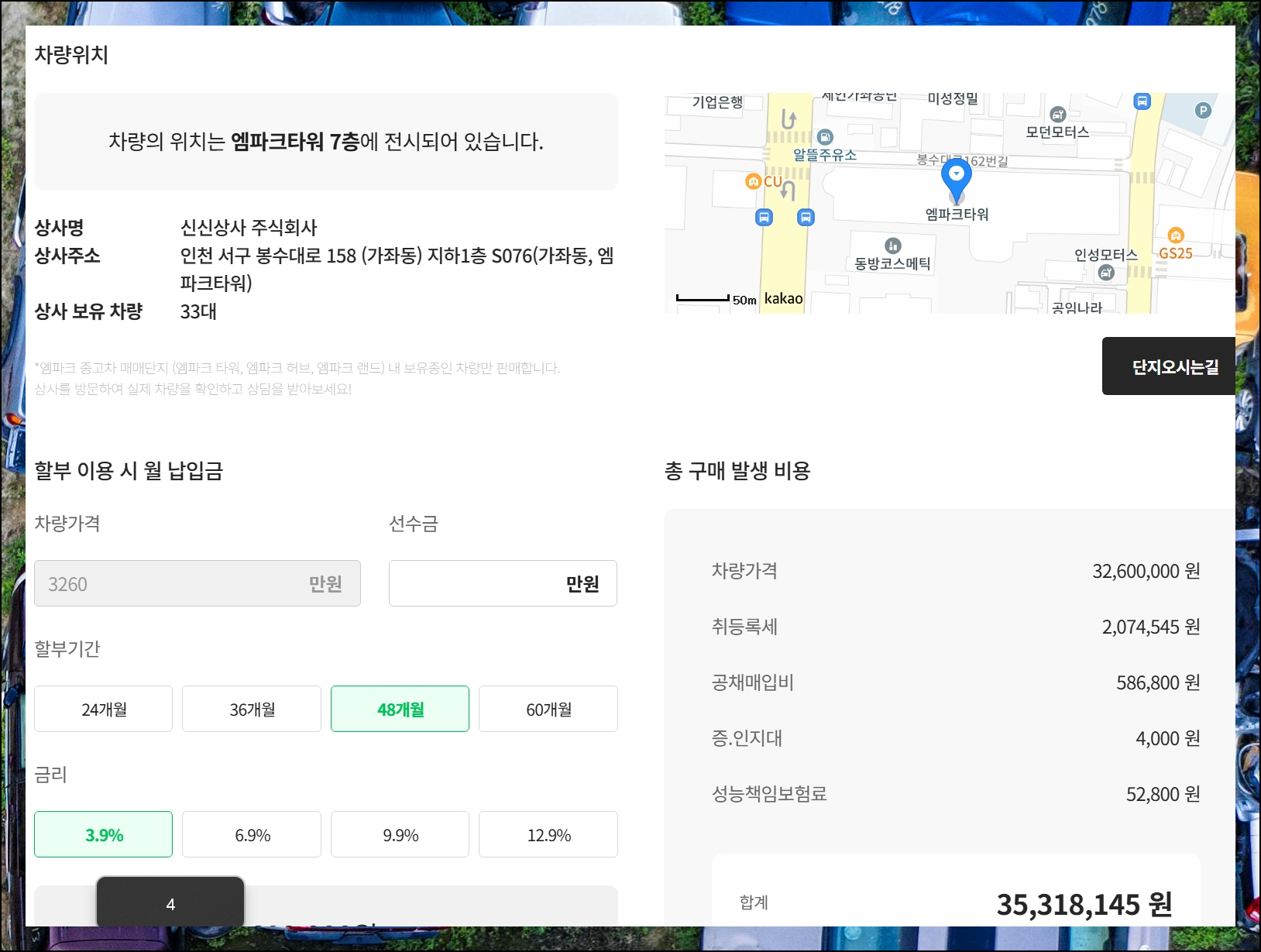 마음에 드는 차량을 선택하면 여러 방향에서 찍은 사진들과 상태 검사 결과를 살펴볼 수 있어요. 가격이 상대적으로 저렴한 중고차들은 기본 사양인 경우가 대부분이니 옵션 목록을 꼭 점검해보세요.