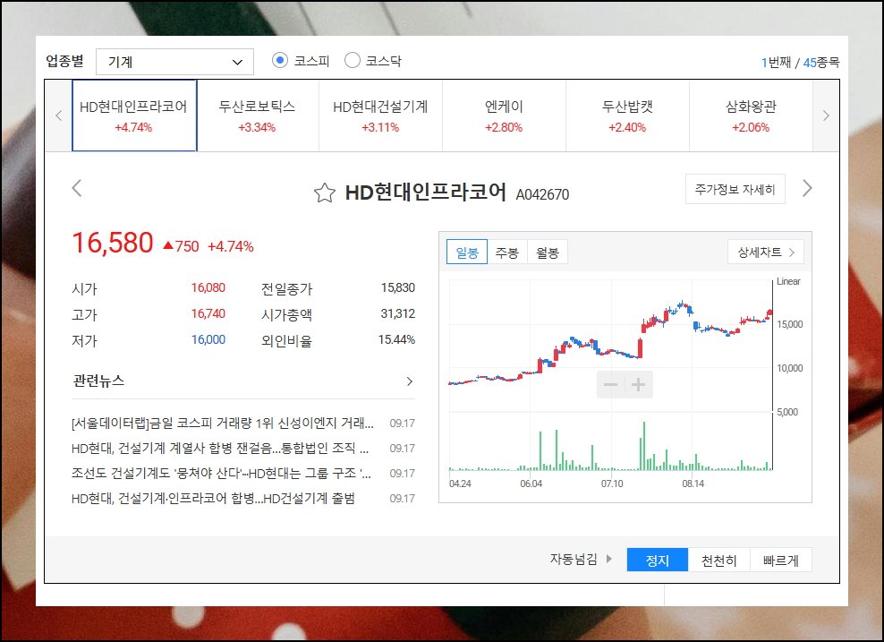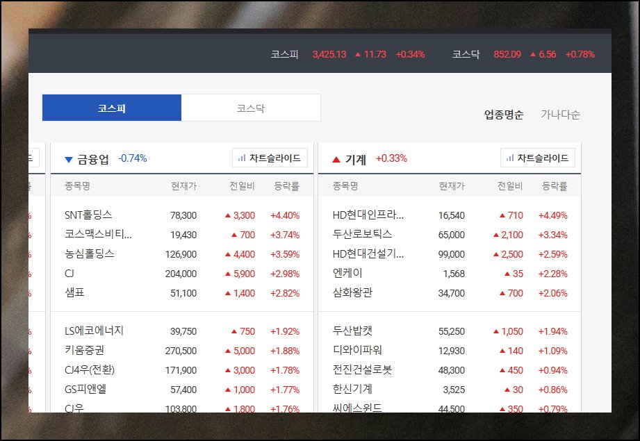 주식 시장의 특징 중 하나는 동일한 산업 분야 기업들이 같은 방향으로 움직이는 경우가 많다는 점입니다. 다음과 같이 표를 통해 모든 종목에 대한 증권시세를 업종별로 분류해서 보면 전체 시장 흐름을 쉽게 이해할 수 있게 되어 있어요. 예를 들어 금융 관련 종목들이 전체적으로 약세를 보이고, 기계 제조업체들은 약간 상승세를 나타내는 식으로 말이죠.