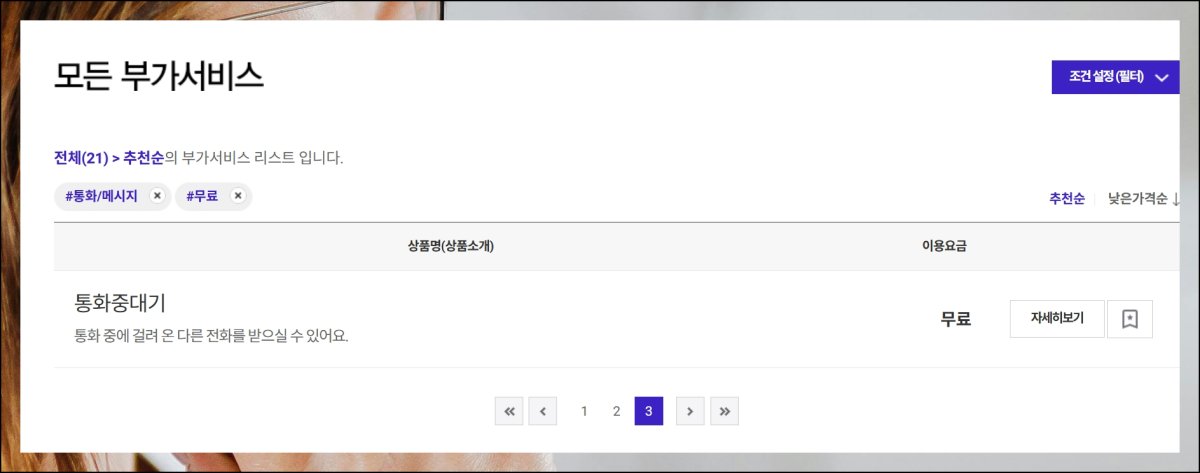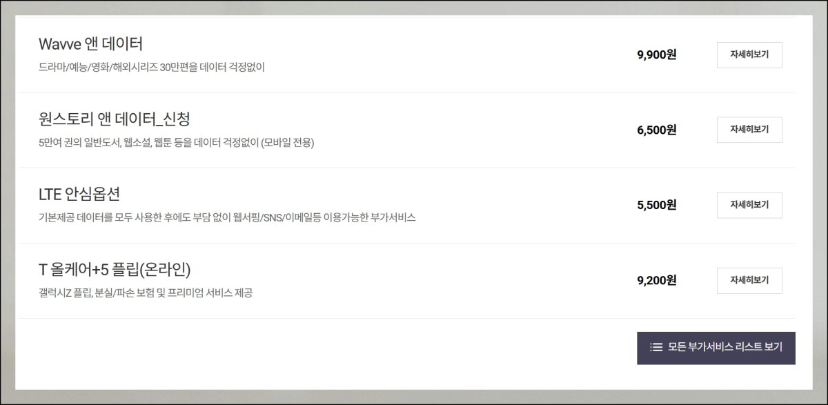 통신업체들은 정말 많은 부가 서비스를 제공하고 있어요. 화면 우측 하단에 "모든 부가서비스 리스트 보기"라는 버튼이 있어요. 이 버튼을 눌러서 전체 목록을 확인해보세요.
