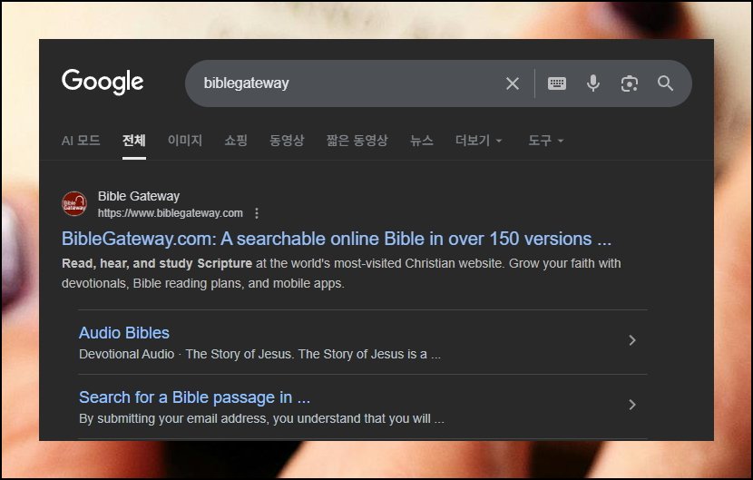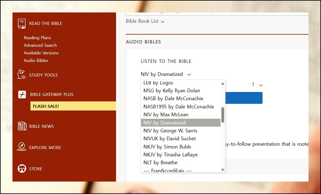 NIV 성경을 비용 부담 없이 들을 수 있는 방법이 있어요. BIBLEGATEWAY라는 웹사이트를 활용하면 되는데요. 영문으로 된 페이지지만 복잡하지 않습니다. 구글 검색에서 BIBLEGATEWAY를 입력한 뒤 사이트로 이동하세요. 상단 네비게이션 바에서 AUDIO BIBLES 메뉴를 찾아 클릭하면 오디오 말씀 페이지로 바로 연결됩니다.