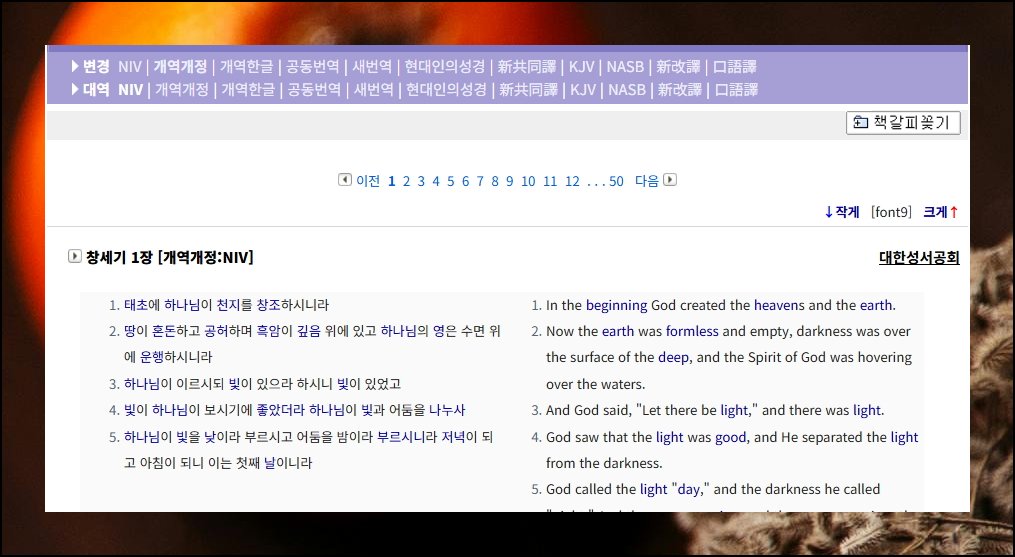 상단 메뉴 중에서 대역이라는 항목을 찾아보세요. 개역개정을 선택하면 레이아웃이 바뀝니다. 왼쪽 영역에는 영어 본문이 표시되고요. 오른쪽 영역에는 개역개정 한글 본문이 나타나요. 두 언어를 동시에 보면서 무료듣기를 하거나 독해 연습을 하면 이해도가 훨씬 높아집니다.