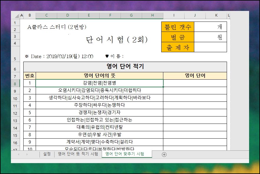 두 번째 시트를 선택하면 영어 단어의 의미를 작성하는 테스트 양식이 보여요. 왼쪽 영역에는 출제자가 사전에 등록해둔 단어들이 나열됩니다. 오른쪽 칸에는 응시자가 각 영어 단어에 해당하는 뜻을 직접 기입하면 되는데요. 시험지 양식 구조가 직관적으로 설계되어 있어요. 별도의 설명 없이도 누구나 쉽게 활용하실 수 있을 겁니다.