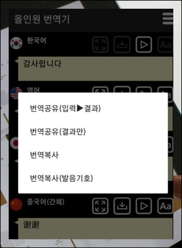 입력 영역 위쪽에 네 개의 아이콘이 있어요. 맨 오른쪽 아이콘을 터치하면 일본어 사전 화면으로 이동합니다. 번역기 어플에서 변환한 내용을 공유하거나 복사하고 싶은 경우가 있죠. 작성된 문장을 길게 눌러주세요. 공유 메뉴가 나타납니다. 복사 옵션도 함께 표시되고요.