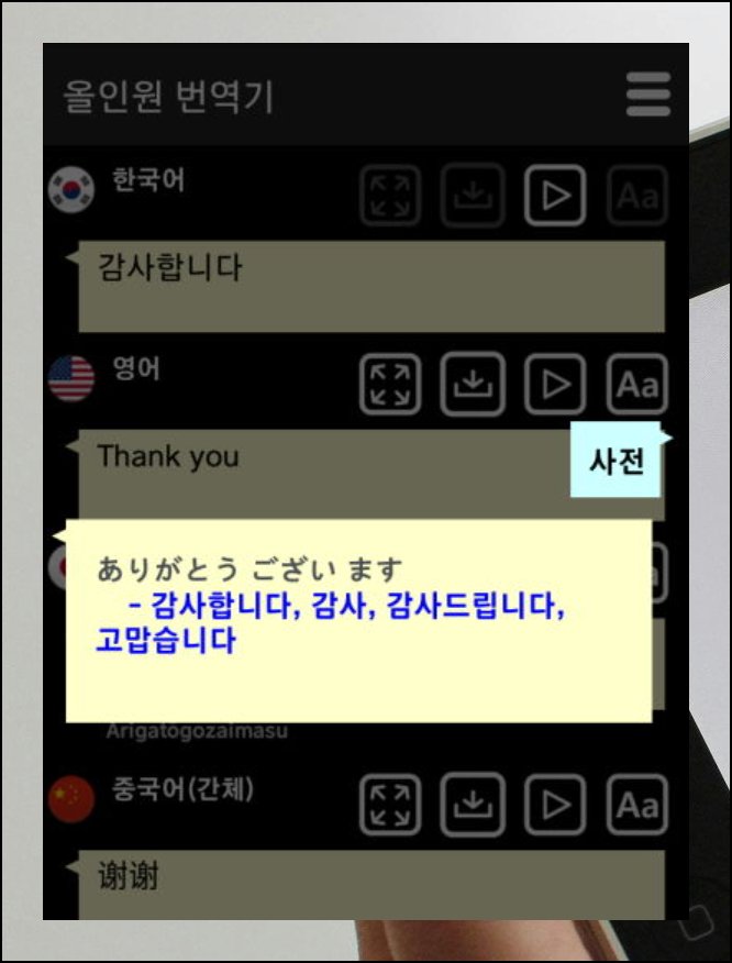 올인원번역기 어플을 찾을 수 있어요. 일본어만 지원하는 게 아닙니다. 영어 통역 기능도 제공해요. 중국어 변환도 가능합니다. 사전 기능이 내장되어 있고요. 발음까지 들려주는 음성 기능도 함께 사용할 수 있습니다.