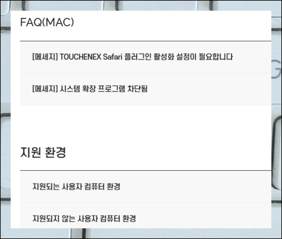 윈도우를 쓰는지 맥북을 쓰는지에 따라 FAQ 내용이 구분되어 있어요. 운영체제별로 정리된 자주 묻는 질문 목록을 살펴볼 수 있습니다. TOUCHENEX 라이센스 인증 오류, 무결성 검사 실패, 파일 훼손 경고, 레지스트리 기록 실패 등 여러 장애 상황이 발생할 수 있습니다. FAQ 섹션에서 각 문제별 구체적인 지침을 확인하세요.