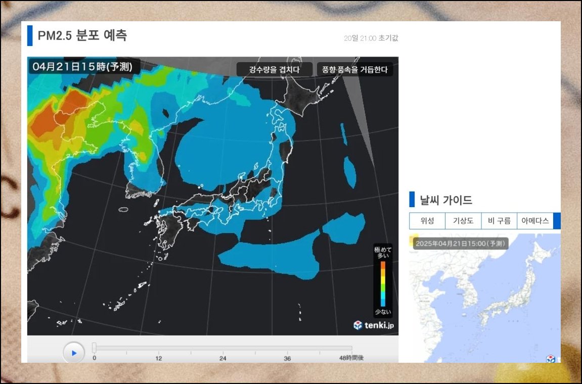 대기 중 초미세 입자 흐름을 실시간으로 좇고 싶다면 일본 기상 플랫폼 Tenki가 탁월한 선택지예요. 표기가 일본어이긴 하지만 수치와 그래픽 요소가 대부분이라 외국어에 익숙하지 않아도 무리 없이 활용 가능합니다.