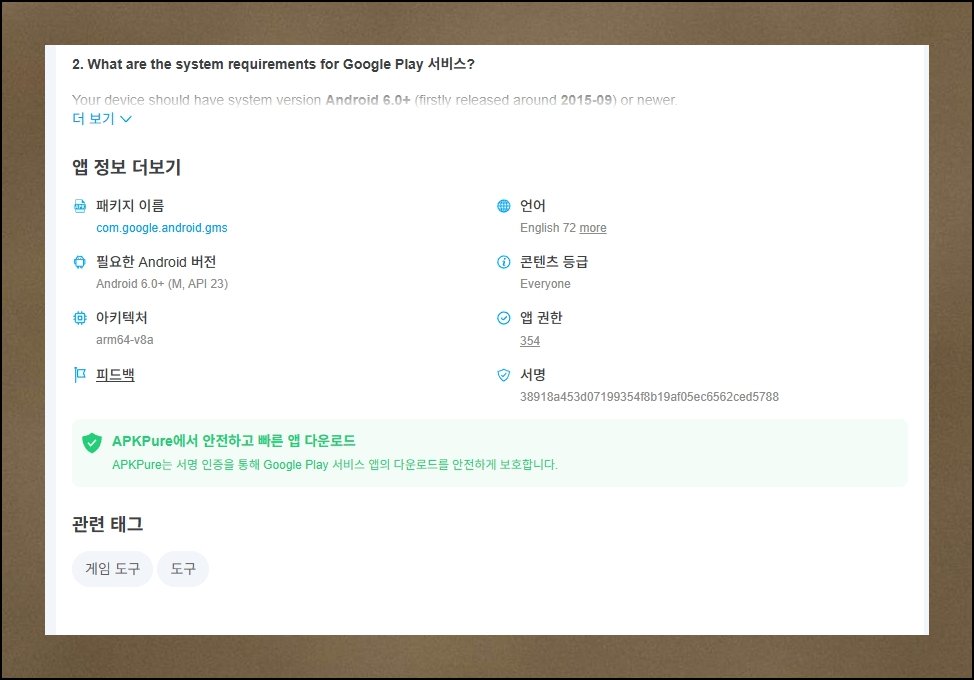 PLAY 스토어 앱의 상세 설명과 함께 설치 패키지를 가져올 수 있는 영역이 화면에 나타납니다. 페이지 우측 윗부분에 위치한 APK 받기 표시를 선택해주세요.