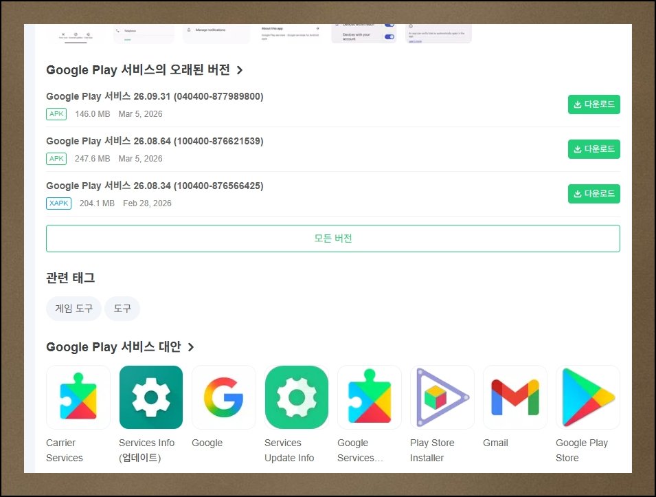 화면을 아래로 내리면 지난 시기에 배포됐던 PLAY 스토어 파일도 함께 올라와 있어요. 현재 기기에서 스토어 앱이 제대로 작동하지 않을 때는 최신 것 말고 한두 단계 낮은 것을 골라 설치하기를 시도해보세요. 연식이 오래된 기기에서는 최근 나온 것과 궁합이 안 맞는 경우가 꽤 있거든요.