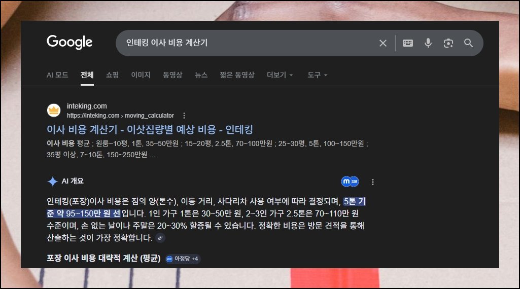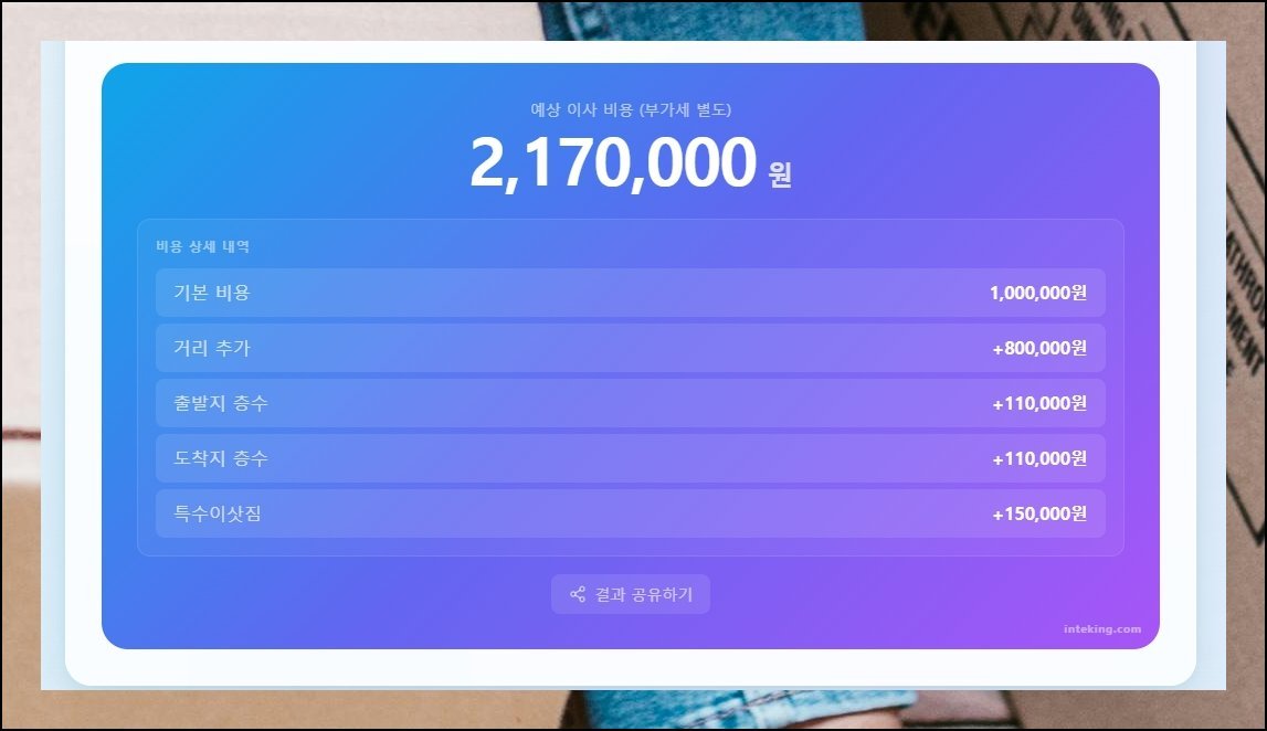 검색창에 이삿짐센터 견적 시뮬레이터를 치면 여러 플랫폼이 나열됩니다. 이 가운데 인테킹이라는 웹사이트가 무료 계산기 서비스를 제공하고 있어요. 면적별 추정 금액과 차량 규모별 단가 폭을 한 화면에서 파악 가능하고, 별도 가입 절차 없이 곧장 활용할 수 있습니다. 이삿짐센터 가격비교의 첫걸음으로 적합한 서비스예요.