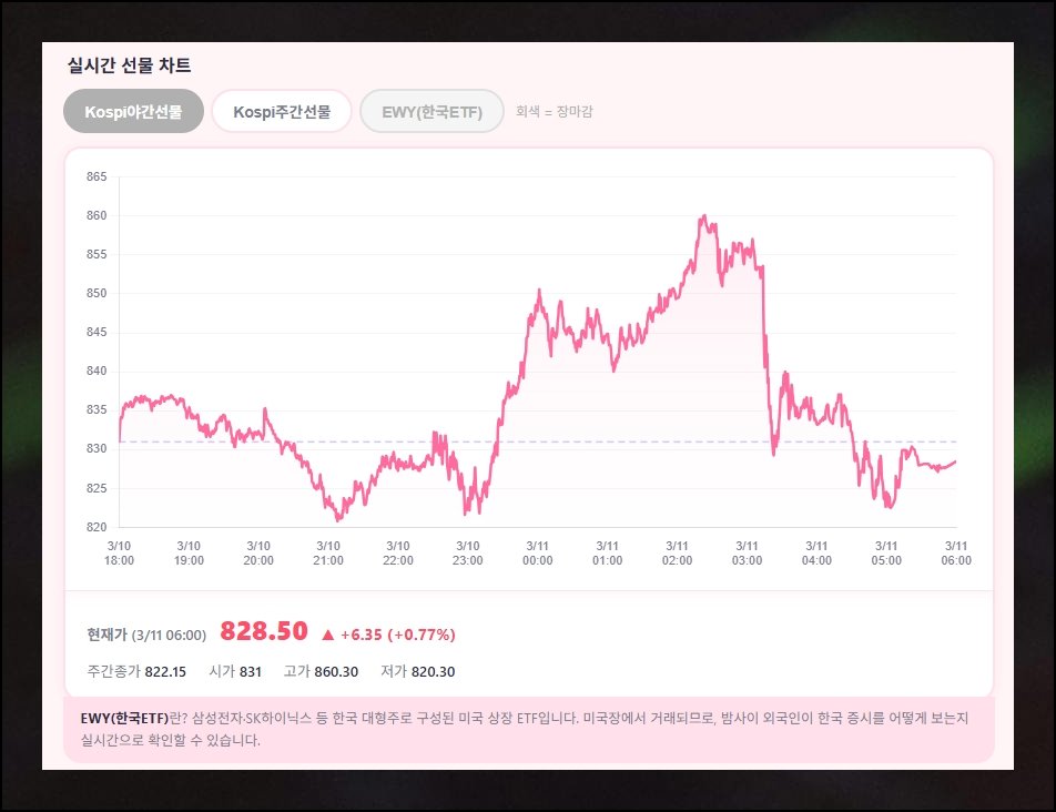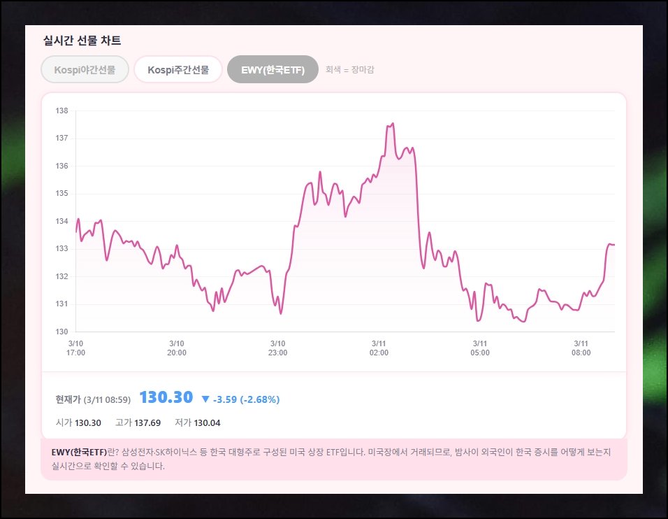 이 글에서는 야간선물 차트 읽는 법부터 EWY 한국 ETF, 국내 주요 지수까지 한 화면에서 실시간 확인하는 방법을 정리했습니다. 퇴근 후에도 코스피 방향을 놓치지 않고 싶은 분이라면 끝까지 살펴보세요.