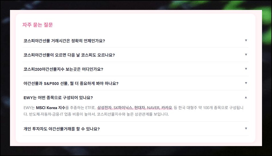 페이지 아래쪽에는 야간선물 거래 시간대, 코스피 상관관계, EWY 편입 종목 등 투자자들이 빈번하게 품는 의문이 모여 있어요. 항목을 누르면 세부 설명이 아래로 펼쳐지는 구조여서 원하는 내용만 골라 빠르게 파악 가능합니다. 이러한 정보에 낯선 분이라도 기초 지식에서 실전 적용까지 한 곳에서 익힐 수 있어요.