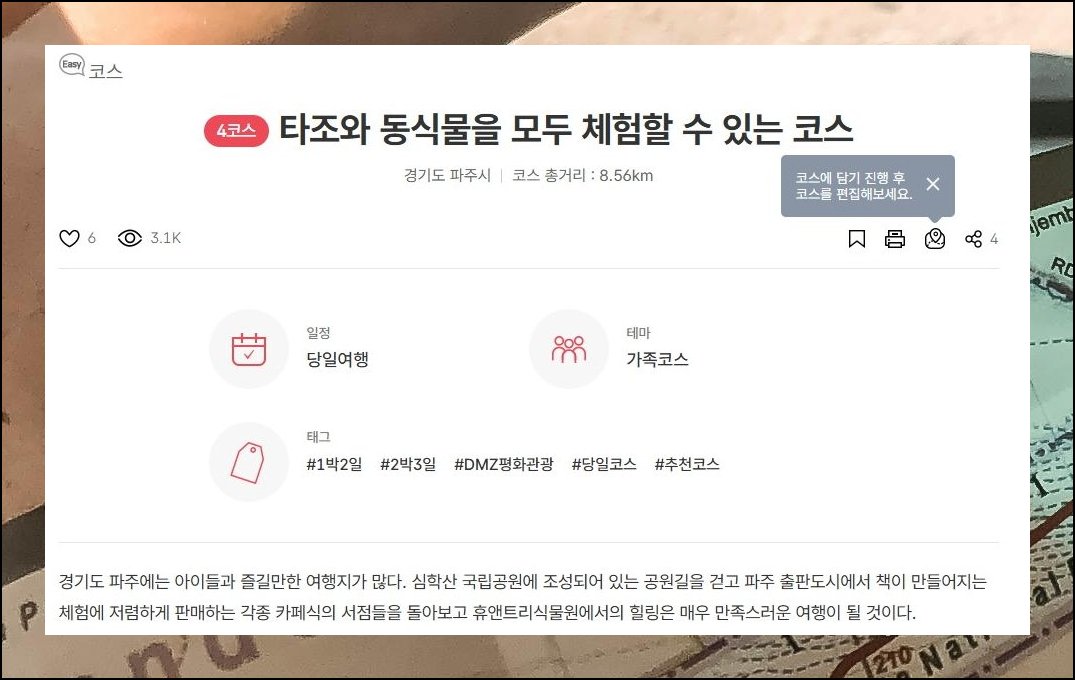 지도 보기를 활성화하면 루트에 속한 각 포인트가 시각적으로 펼쳐집니다. 심학산 산림공원부터 파주 출판도시, 콩스콩스두부, 우농타조농장까지 서울 근교에서 하루 분량으로 설계된 경로예요. 별도로 머리 쓸 필요 없이 안내대로 움직이면 그만입니다. 한 차례 외출만으로 다채로운 갈만한곳을 빈틈없이 경험 가능해요.