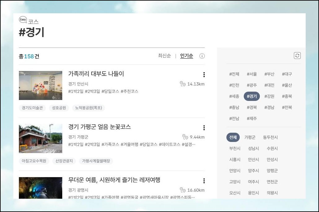 대한민국 구석구석 플랫폼을 열어보면 서울 근교 당일여행 갈만한곳을 거리순으로 정리해서 보여주니 탐색이 훨씬 수월해요. 추천 코스도 함께 제공되기 때문에 동선 짜는 수고를 크게 줄일 수 있습니다. 서울에서 출발해 근교 명소 몇 곳을 엮으면 당일여행만으로도 충분히 특별한 하루를 채울 수 있어요.
