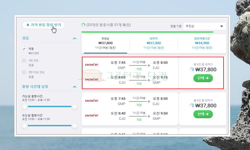 4) 최종적으로 찾은 제주 저가항공권의 왕복 가격은 37,800원입니다. 이스타젯의 상품인데요. 가격이 마음에 든다면 '선택' 버튼을 눌러 예매사이트로 가서 결제를 하면 되고, 좀 더 저렴한 가격으로 찾고 싶다면 '가격 변동 알림 받기' 버튼을 눌러주세요.