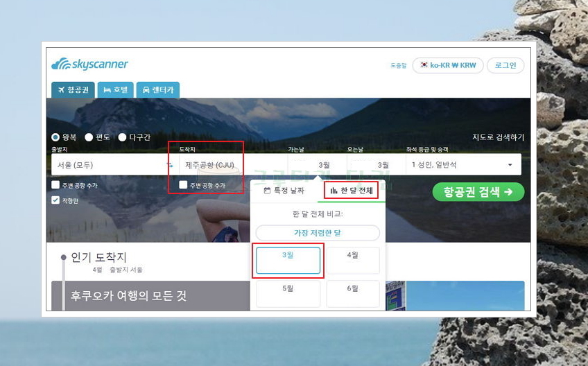 2) 도착지를 제주로 하고, 가는날과 오는날을 '한 달 전체'로 설정해 주세요. 날짜에 따라 티켓의 가격이 달라지기 때문인데요. 다음 단계에서 설명해 알려드리겠습니다.